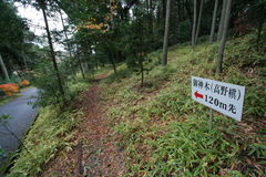 社殿の左手に西側参道があり、「御神木(高野槇)120m」との案内。