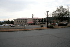 ゴルフ場の前に当社の境内入口があり、車を進めると広い駐車場。