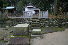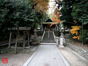 参道を進むと左手に手水舎。階段を上ると萱葺の社殿。