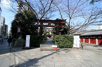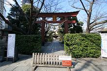 生垣の奥に赤い鳥居があり、参道が北に延びている。