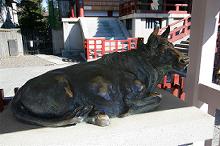 社殿の前には、神牛の像が置かれ、左に白梅、右に紅梅が咲いていた。