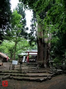 社前には、大鹿桜が枝をのばし、鳥居杉の巨木が聳えている。