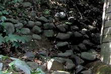 全面に敷かれているとあり、本殿の後の斜面にそれっぽい石がある。