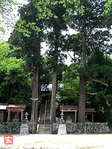 天神山の麓に境内があり、境内中央に3本の巨木が聳えている。