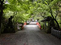 道路わきの鳥居から、参道を歩くと、赤い欄干の橋がある。