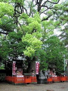 楠宮稲荷社の社殿の後ろに大きな楠がある。