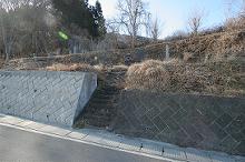 道路脇に階段があり、階段の上に石祠。