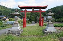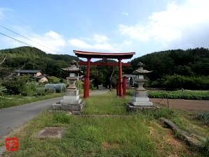 北へ入って集落の奥、車道脇に二基の石灯籠と赤い鳥居が建っている。