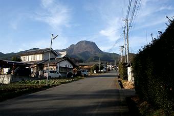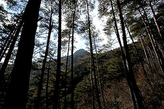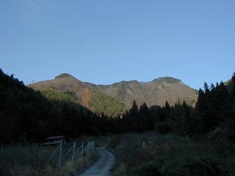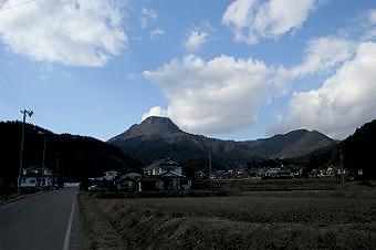 当郷登山口近くの子檀嶺神社、奥に見える子檀嶺岳 |