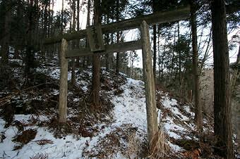 すぐに林道と分岐する小道を登ると小さな木の鳥居がある。