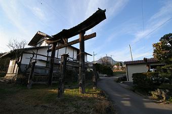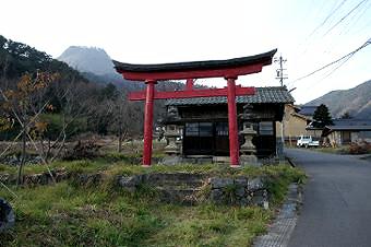 村松神社参道鳥居と、奥に見える子檀嶺岳 |