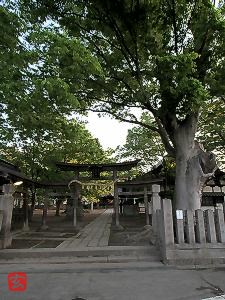 鳥居の右手に巨木が聳え、左手に手水舎がある。