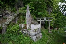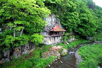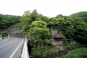 松明山の麓にある望月橋のそば、鹿曲川に面した絶壁を穿って弁財天が祀られている。