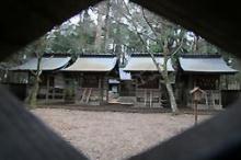 拝殿の格子からのぞいてみると、正面に四棟並んだ社殿があり