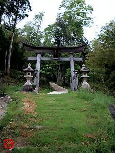 草に覆われた参道の坂道を上ると木の鳥居が建っている。