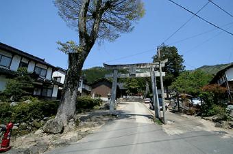 参道を進むと、背の高い木の傍らに石の鳥居。