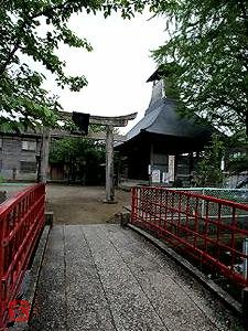 社前に小さな川があり、赤い欄干の橋を渡ると境内。