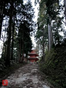 出雲大社の本殿の柱に妙見杉を提供した縁で、塔は日 本海を船で運ばれ、寛文五年(一六五五)五月に標高八 〇〇mのこの地に移築されました。