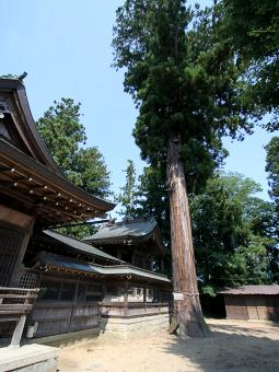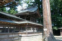 本殿の垣の外、右手に御神木らしき木が聳えている。