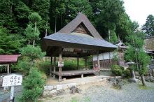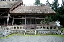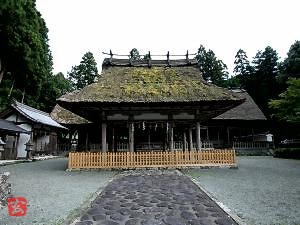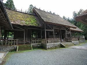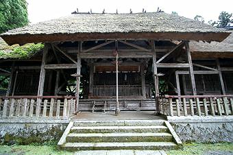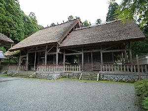 境内中央に萱葺の美しい拝殿があり、境内左手に舞殿。