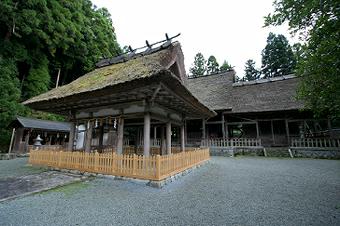 本殿の左右にも萱葺の覆屋根があり