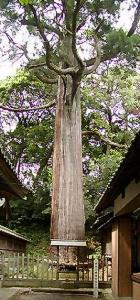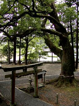 境内社が2つ並んだ参道を歩くと、大きく枝を延ばした巨木の側に