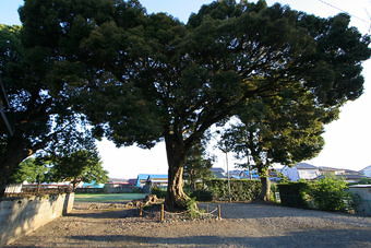 社殿の右手に大きく枝を延ばした御神木に朝日があたって美しかった。