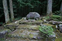 参道を進むと、小川にかかる石橋があり、その奥に鳥居。