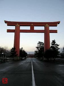早朝で車も少なかったので、道路の真ん中に立ち、大鳥居を撮影。
