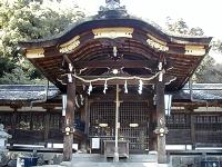 松尾大社 大山咋神と市杵島姫命の二神を祀る。 大宝元年(七〇一)秦忌寸都理が、松尾山大杉谷の 磐座の神霊を勧請し、当地に社殿を建立したのが起りと 伝え、平安時代には皇城鎮護の神として、また中世以 降は醸造の神として人々の信仰を集めている。 本殿(重要文化財)は「松尾造り」と呼ばれる珍しい 建築で、天文十一年(一五四二)に改築されたものである。 宝物としては、等身大の男神坐像ニ体、女神坐像 一体(ともに重要文化財)を有する。 毎年四月に行われる松尾祭には、神輿の船渡御 があり、多くの人々で賑う。 −案内板より− 旧官幣大社。祭神は大山咋命・中津島姫命(市杵島姫命)の二柱。大山咋命は『古事記』に「大山咋神、亦名は山末之大主神、此の神は近淡海国の日枝山(滋賀県大津市・日吉大社)に坐す。亦、葛野の松尾に坐す鳴鏑に成りませる神」とあり、その葛野の松尾が本神社にあたる。女神の「市杵島姫命は胸形の中津宮に坐す」神で、九州・宗像大社の中津宮をさすが、これには異説がある。本神社の創祀は文武天皇の太宝元年(701)に秦忌寸都理はたいみきとり(つり)が社殿を初めて造営したとするが、神社の神山には秦氏の祭祀よりも古い時代の遺跡があることから推しても、秦氏以前からここに奉祭神があったことがわかる。 −『神社辞典』− |