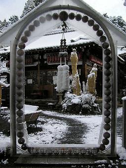 雪の白い花が咲いたような木々の参道を歩くと境内。