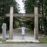 | 【貫無し鳥居】 貫の無い鳥居、つまり二本の柱と笠木のみの門。これを鳥居と呼んでよいかどうかは意見が分かれるかもしれないが、月山本宮入口にあり、また月山中之宮からの参道にあって注連縄を張られているので鳥居として機能していると判断した。 また、福井神社にも背の低い貫の無い鳥居(のようなもの)が存在する。 |