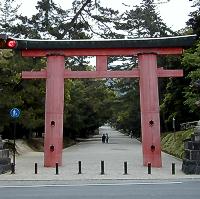 | 【奈良春日形】 ・笠木の下に島木があり、笠木に反りがある。 ・柱、貫、島木は朱塗り(丹塗り)。 ・笠木の鼻(両端)は斜めに切り落としているが、島木は垂直に切られている。 | 奈良春日大社一之鳥居